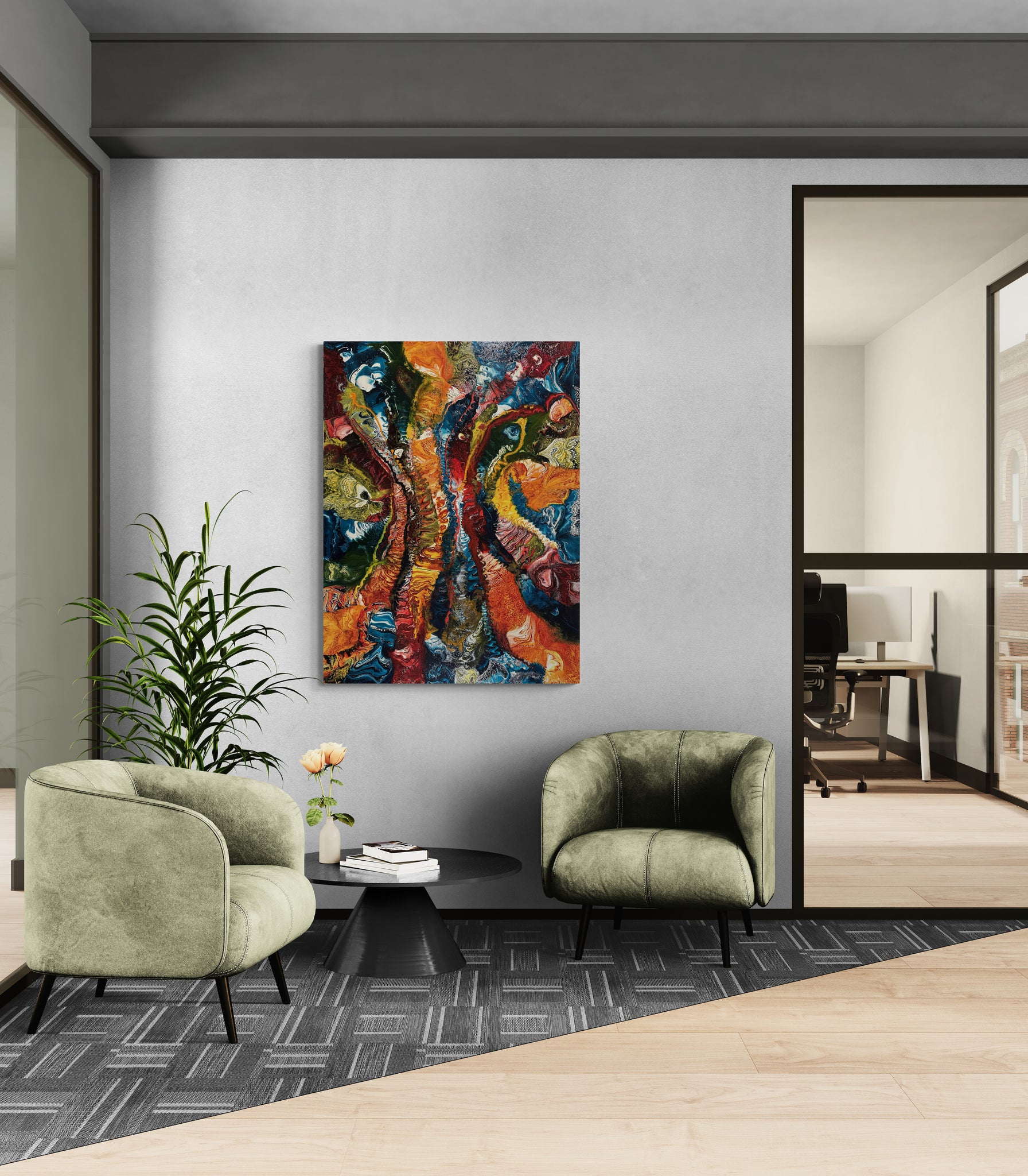 Modern interior with green armchairs and a colorful abstract painting on a gray wall.