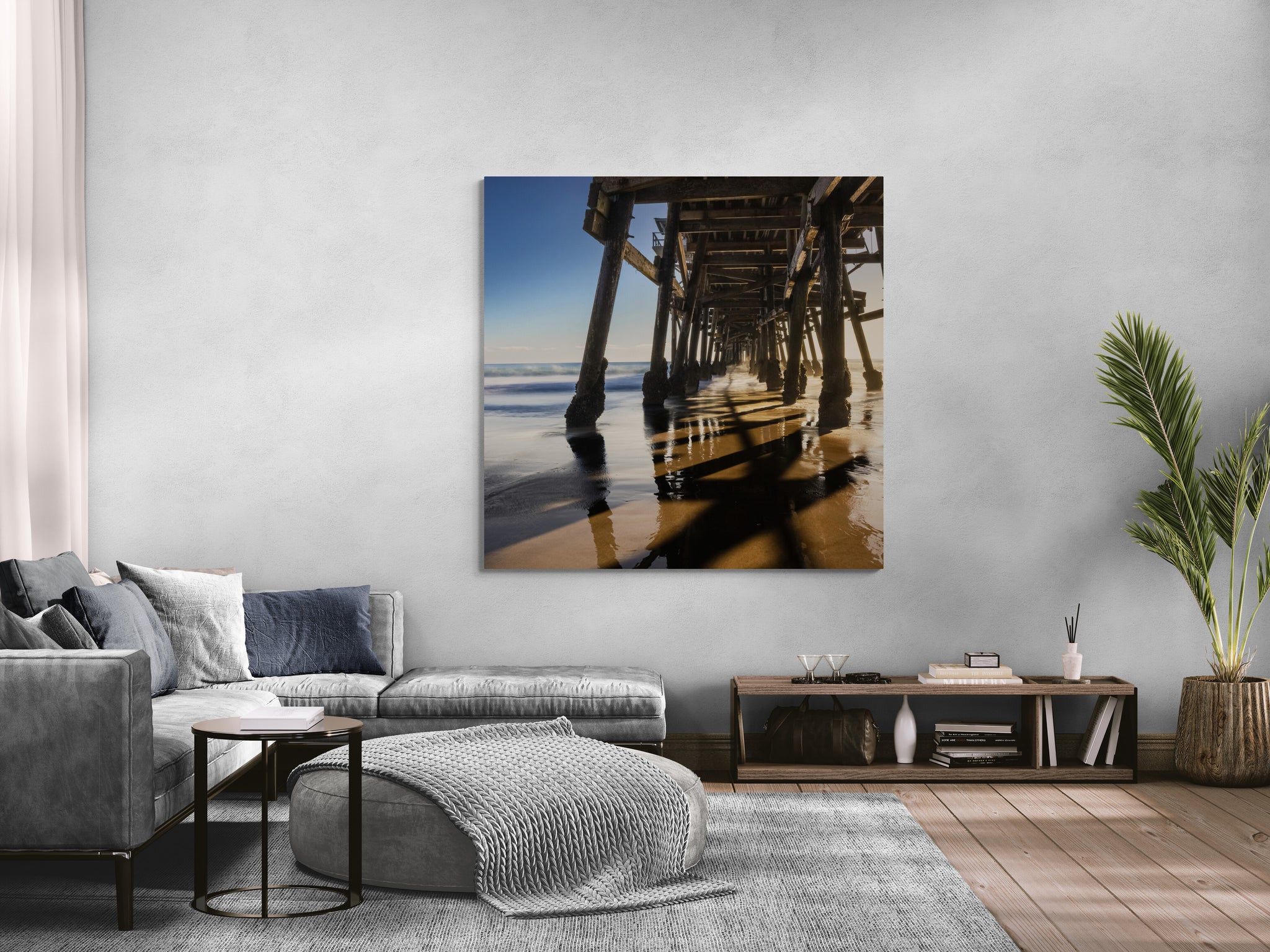 Description: Beneath the Surface offers a look into a hidden world, captured from a unique low-angle perspective. The photograph transforms the familiar pilings of a pier into a series of arches and shadows, creating a rhythm that guides the eye into the frame. The use of a long exposure softens the movement of the tide, which, along with the warm, luminous light, creates a harmonious atmosphere. This piece invites contemplation on the beauty that lies just beyond our ordinary view, offering a profound sense of connection.