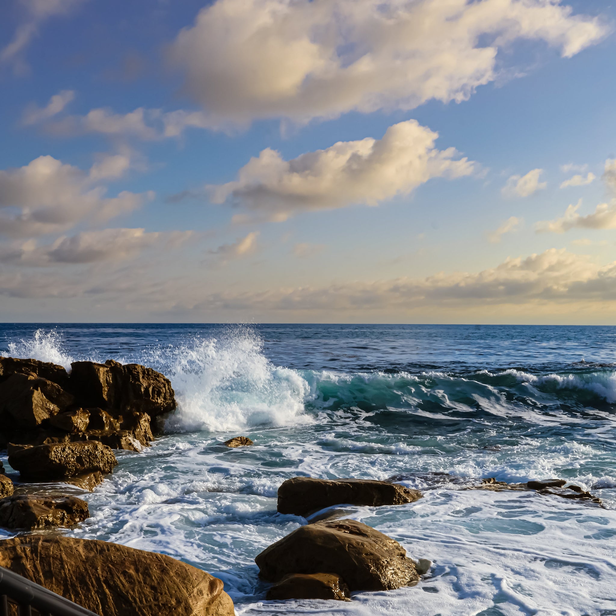 Description: The Unfolding Blue is a powerful seascape that highlights the rich textures and colors found where land meets ocean. The vivid blues of the water and sky contrast with the warm, textured rocks, while the churning foam of the waves adds a sense of perpetual motion. It's a study in the beautiful chaos and natural drama of the coast, capturing a fleeting moment in time.
