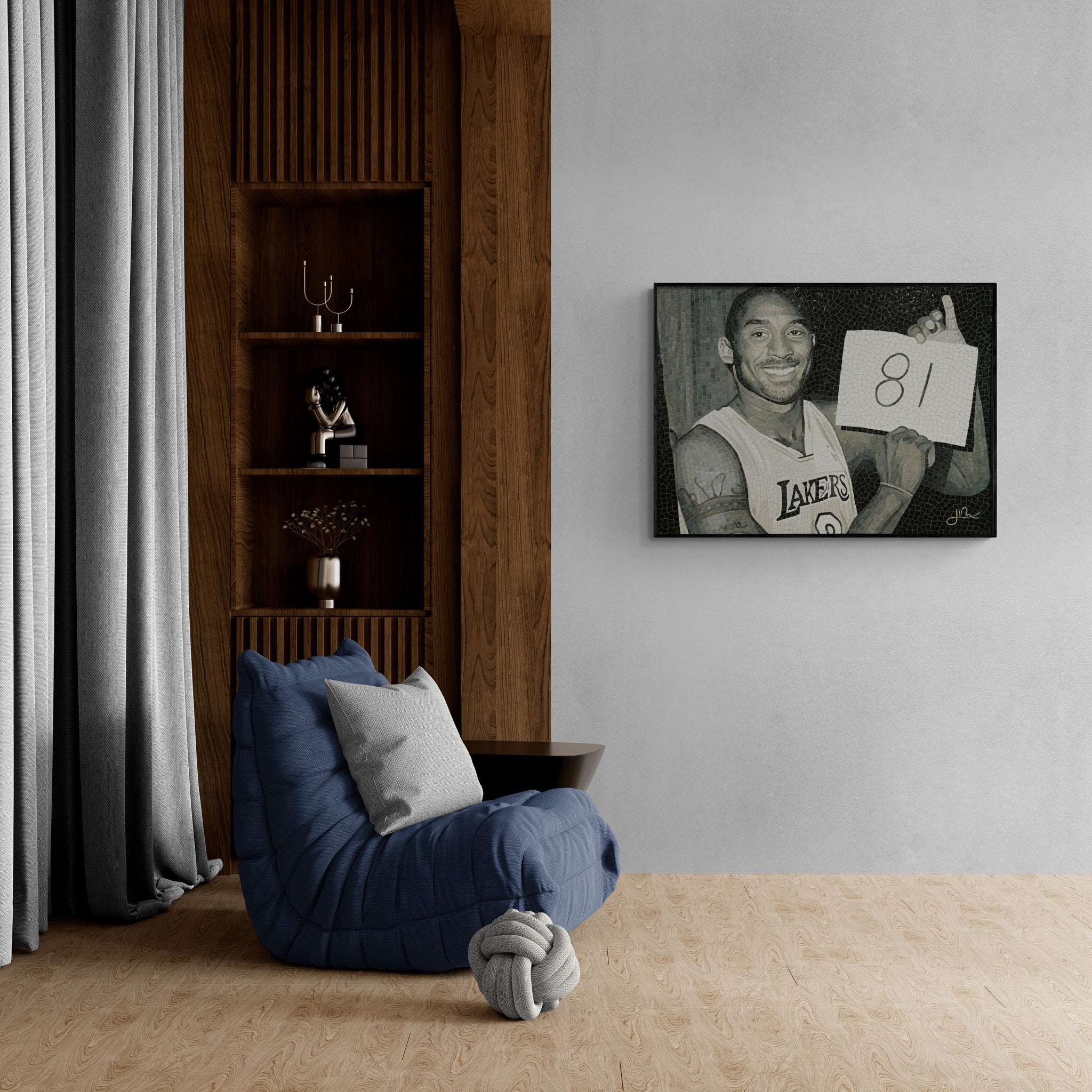 Mosaic artwork of a basketball player holding a sign with the number 81, wearing a Lakers jersey.
